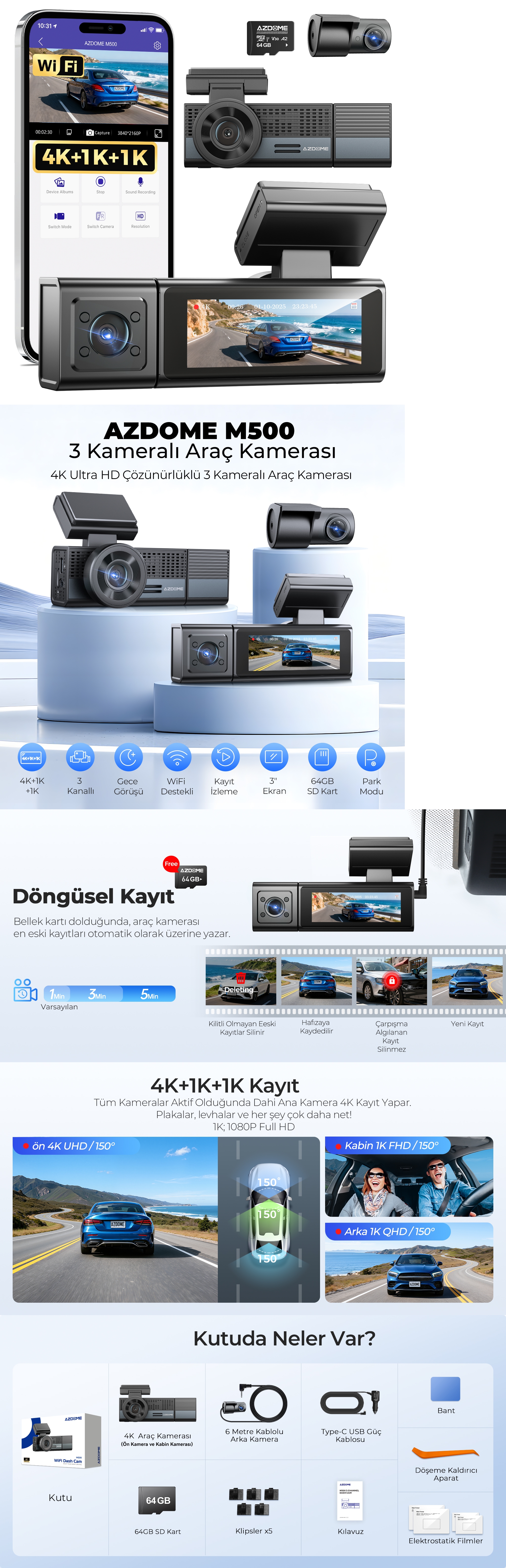 Azdome M500 4K 3 Kameralı Araç Içi Kamera